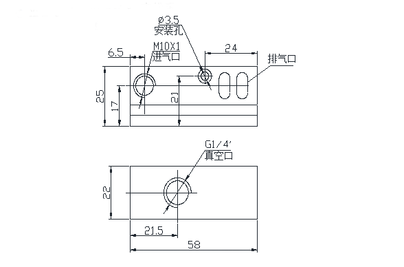XFK-04的真空發(fā)生器的外形尺寸(不含凸出的快速接頭部分)長(zhǎng)58mm×寬22mm×高25mm。
